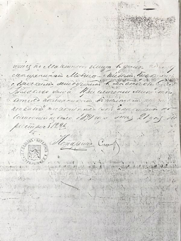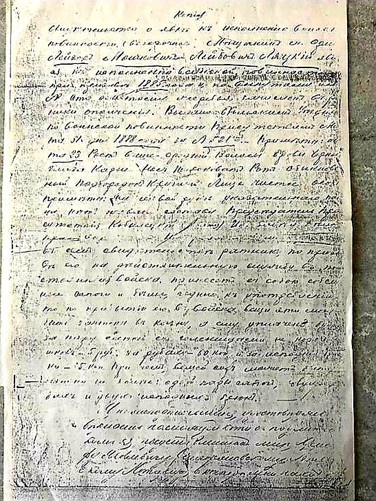 To my devoted daughter in law Jenny Light and to my son [Karl?] Kalman Light. I am, thank God, well. I thought that all my children were angry at me and had decided not to write me any letters, since even from you I haven’t gotten a letter in four months and you used to write me every month. Also, when I wrote to my children regarding Aunt Toybe, that it hadn’t yet come to getting married, that [illeg.] still deliberating about what I should do, they had already stopped writing. Then all of a sudden a letter came from [Otvostsk? – partly illeg.] to someone in Bialystok and that person wrote to me in Orle, saying that the other person had talked to my children in New York and that the children had impudently said that if I get married they won’t send me even one cent.  Since I haven’t gotten any letters, that must be true. But then a couple of weeks ago I got a letter from Lazar. He writes me what that person wrote to me, that I won’t get one cent, is a lie and I shouldn’t believe it. But Kalman Limenske happened to read the letter that I had gotten and he said, What became of them in America? Did they become so corrupted in America? If they contributed 10 cents a week they would have [illeg.] to send you. In Bialystok they distribute [sentence along crease in paper illegible.] That’s how amazed Kalman Limenske was. Then ultimately I got the letter from Lazar that said it’s a lie and I shouldn’t believe it. [Illeg.] if they send it, if they don’t send it, with God’s help I won’t be abandoned, and if you can improve your situation , you should do that. That’s what was written in [your?the?] letter, but [illeg.] it must have been that other person who said that they will not send a groshen. [Russian equivalent of a cent.]