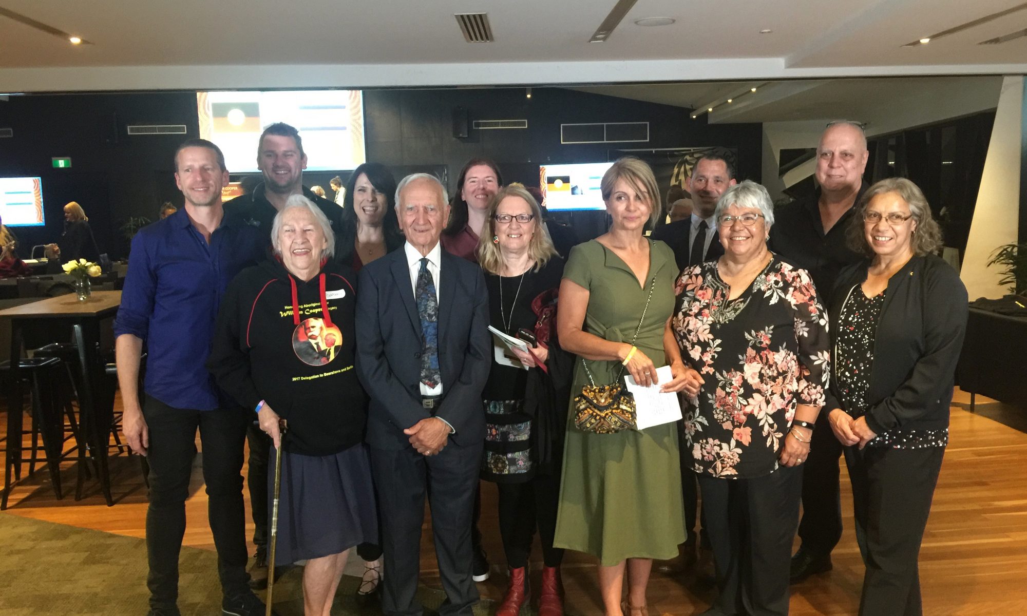 Professor Jacinta Elston, Monash University and William Cooper’s great grandchildren, Leonie Drummond and Lance Turner, with Eli Rabinowitz